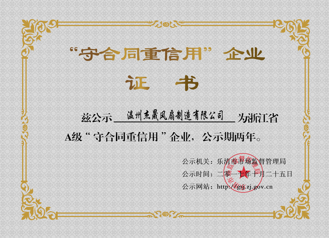 杰晟风扇荣获2017年度“守合同重信用”企业的荣誉称号
